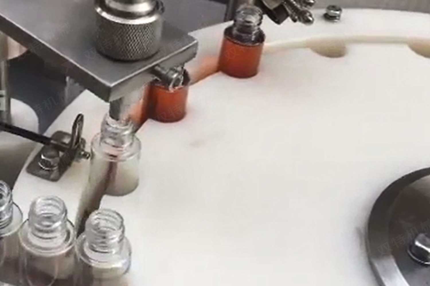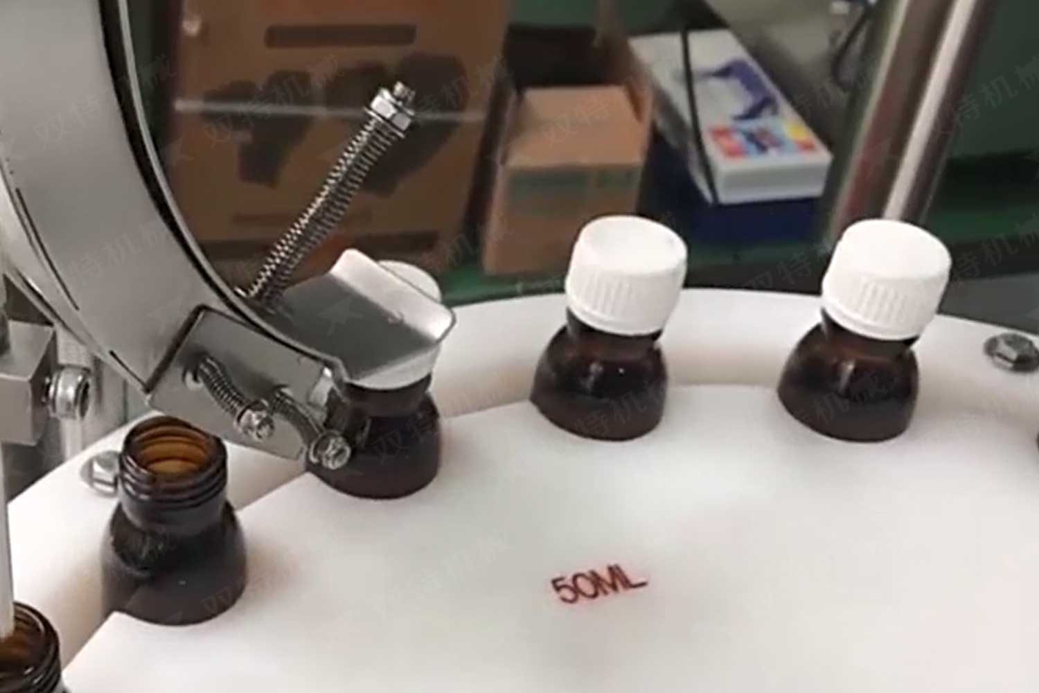 旋蓋機主要用于玻璃廣口瓶的三、四、六鐵蓋真空旋蓋,用兩根不同速度的皮帶壓瓶蓋,因兩根皮帶的速度不同,對蓋進行搓蓋收緊達到旋蓋目的。在自動上蓋之前對瓶口吹蒸汽加熱,吹掉冷空氣,換上高溫蒸汽,立即旋蓋,根據熱脹冷縮原理,蒸汽冷下來就自然形成了瓶內真空,達到了真空旋蓋的目的。自動旋蓋機可以和濃醬灌裝機、蜂蜜灌裝機、辣椒醬灌裝機組合在一起,形成一套全自動灌裝設備,是現代調味品企業的得力幫手。